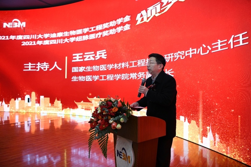 颁奖仪式由国家生物材料中心主任、学院常务副院长王云兵教授主持,他首先介绍了到场嘉宾并对与会嘉宾和师生们表示热烈的欢迎,同时,对迪康药业、纽脉医疗在加强校企合作,推进学科发展所做的工作予以高度的评价和衷心的感谢,并对本次获奖的同学表示祝贺。