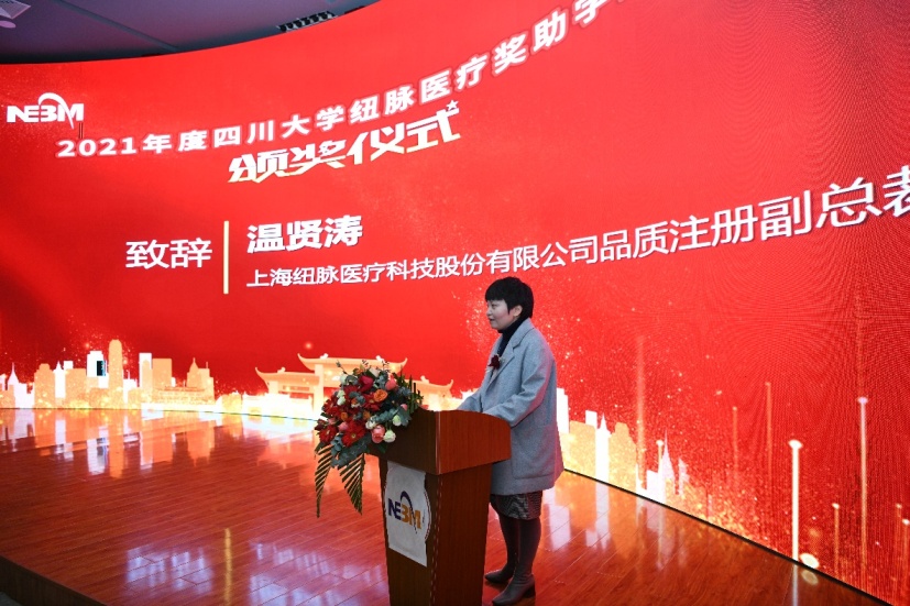 曹洪芙同学作为纽脉医疗助学金获奖代表发言,对上海纽脉以及学长学姐们表示感谢,未来将脚踏实地、求是创新,力争取得更多的突破与提升,不负众望,不负韶华。