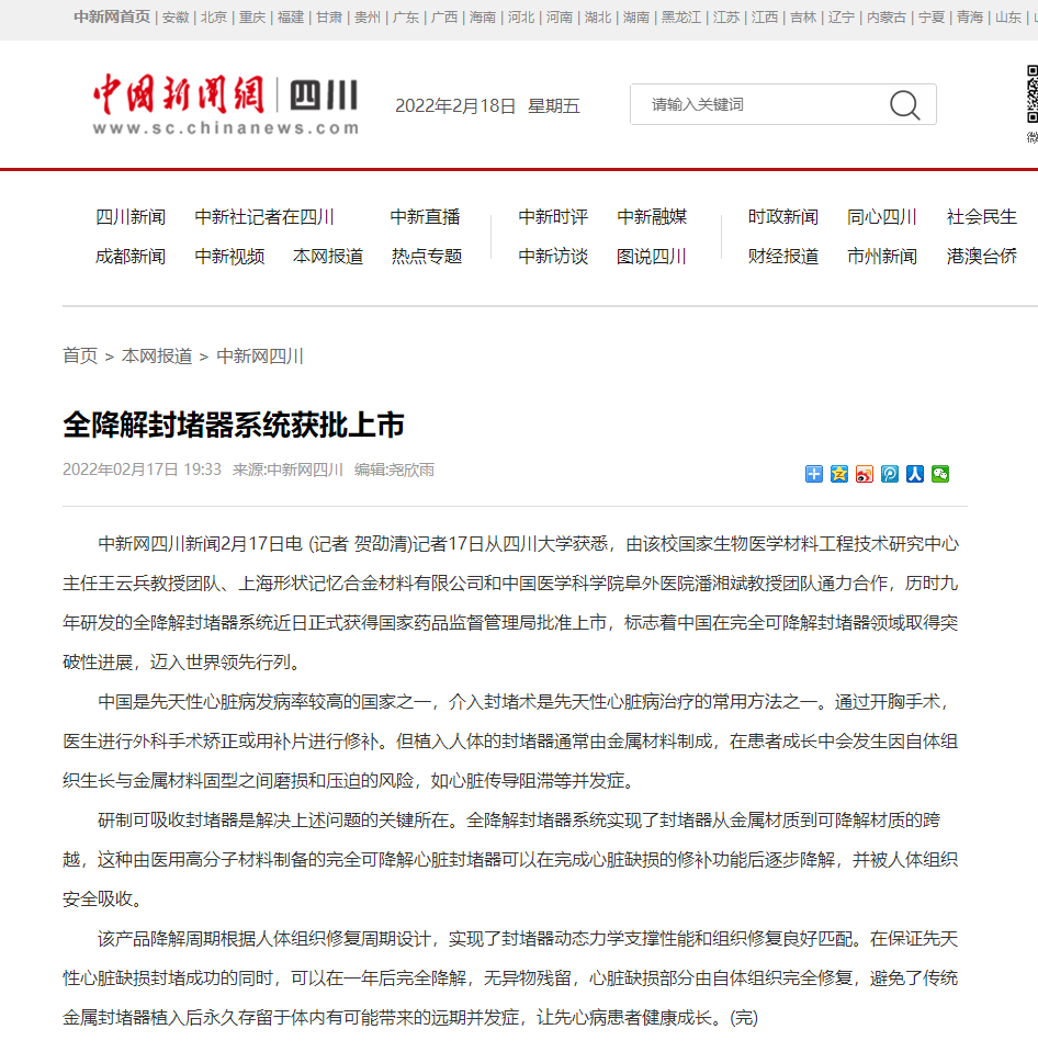 近日,william威廉中文官网国家生物医学材料工程技术研究中心主任王云兵教授团队、上海形状记忆合金材料有限公司和中国医学科学院阜外医院潘湘斌教授团队通力合作,历时九年研发的全降解封堵器系统正式获得国家药品监督管理局批准上市,标志着中国在完全可降解封堵器领域取得突破性进展迈入世界领先行列。