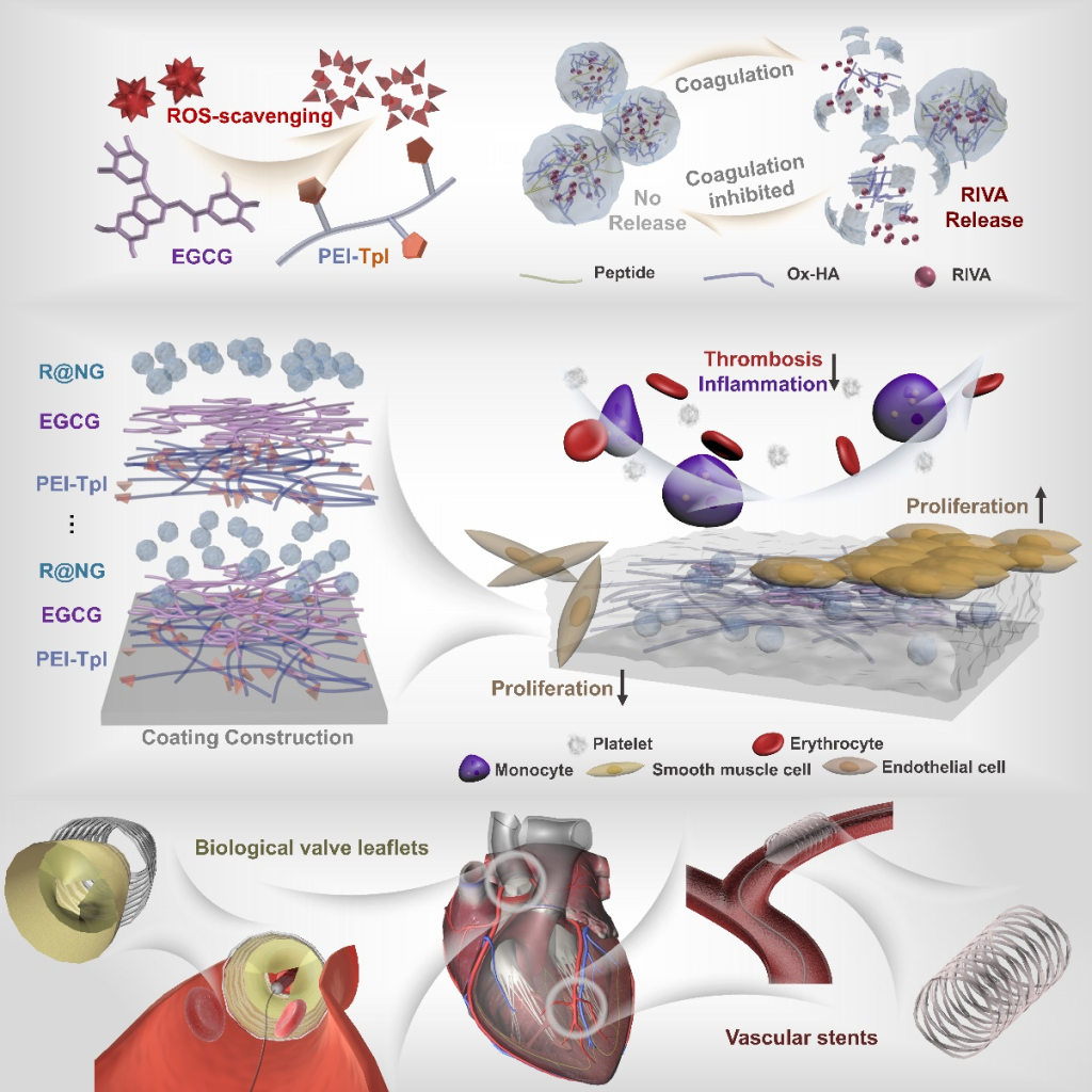 心血管植介入材料与器械(血管支架、心脏瓣膜、心脏封堵器、人工小血管等)植入体内后面临复杂且多样的组织应答,如凝血和炎症反应等,严重制约了器械的服役性能,早期的应答失衡也是导致器械失效的重要诱因。血管内皮层作为生物体固有的抗凝抗炎界面,能够有效维护血管周围微环境的稳态平衡,调节凝血及炎症组织反应。实现植入器械表面完整健康的内皮细胞层再生,是心血管植介入材料表面的理想状态,也是当前科学家们追逐的研究方向和技术难点。然而,以内皮化为目的的改性手段往往忽视了再内皮化前的组织反应对内皮化进程带来的不良影响,材料表面的功能修饰往往也因植入前期的凝血与炎症应答紊乱面临失效的风险。