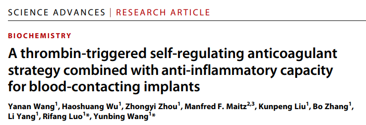 近期,国家生物医学材料工程技术研究中心王云兵教授团队,围绕心血管植介入器械植入后面临的组织反应为出发点,以内皮细胞表面血栓调节蛋白的自调节抗凝功能为灵感,结合材料植入后的全过程抗炎功能需求,提出了一种辅助心血管植介入材料表面再内皮化的新思路,即一种结合抗炎功能的凝血酶敏感自调节抗凝涂层改性新策略。在材料表面没有实现正常内皮覆盖的早期阶段,这种涂层有望代替并行使部分内皮细胞的血栓调节蛋白抗凝血功能,从而抑制材料早期剧烈的凝血反应,同时配合全过程的抗炎保护,为后续的器械表面再内皮化进程提供良好微环境保障。相关成果发表在国际知名综合性期刊Science Advances上(2022, 8, 9, eabm3378),国家生物医学材料工程技术研究中心/williamhill英国官网2019级博士研究生王雅楠为该论文第一作者,国家生物医学材料工程技术研究中心主任/williamhill英国官网院长王云兵教授、以及国家生物医学材料工程技术研究中心副研究员罗日方为该论文共同通讯作者。该论文工作同时还得到了德国莱布尼茨聚合物研究所Manfred F. Maitz博士的相关帮助。国家生物医学材料工程技术研究中心为该论文的唯一通讯单位。