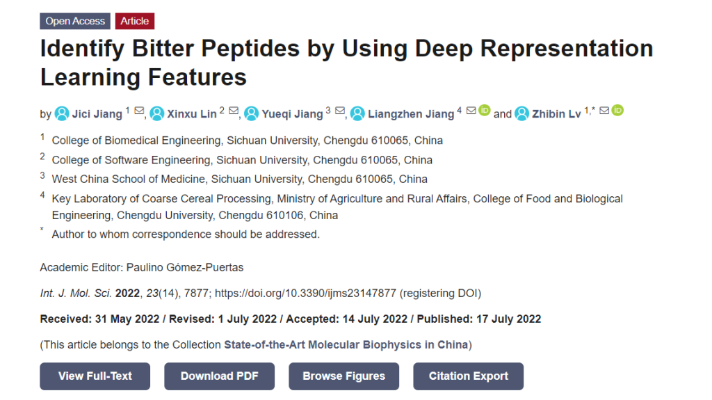 2022年7月17日,我院2020级本科生蒋济慈负责的大创团队科研成果“Identify Bitter Peptides by Using Deep Representation Learning Features”在《International Journal of Molecular Sciences》在线发表(全文链接:https://www.mdpi.com/1422-0067/23/14/7877)。