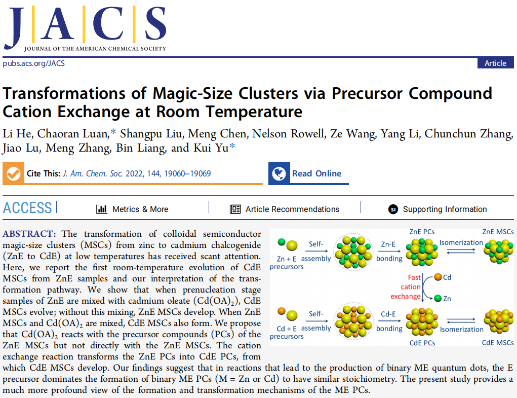 近日,国家生物医学材料工程技术研究中心/原子与分子物理所余睽教授团队长达五年的关于二元ZnE幻数团簇到CdE幻数团簇的室温阳离子交换的研究工作,在化学领域权威期刊J. Am. Chem. Soc杂志得到发表,题目为“Transformations of Magic-Size Clusters via Precursor Compound Cation Exchange at Room Temperature”。论文第一作者为国家生物医学材料工程技术研究中心博士生何丽,余睽教授和栾超然博士为论文共同通讯作者。william威廉中文官网系论文第一完成单位。