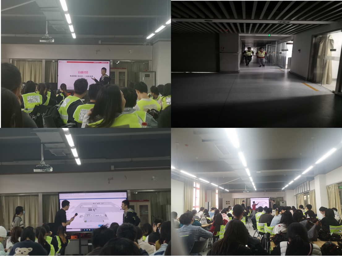 第三部分:大型火灾逃生演练。这是今年新增的科目,在现场整栋大楼“着火”的情况下模拟“逃生”。只见大楼所有的报警器突然响起,所有的防火卷帘门都全部降下,楼道里只剩下应急电源昏暗的灯光。同学们分两组正在四楼和五楼“上课”,警报就是“命令”,队长和安全员及时通知到位,并带领同学们根据安全指引,经历重重考验,快速有序地“逃生”到楼下。演习结束后,教官邀请队长和安全员与同学们进行交流,就如何迅速通知、选择合适的“逃生”路线、遇到障碍如何处置等情况展开深入探讨。