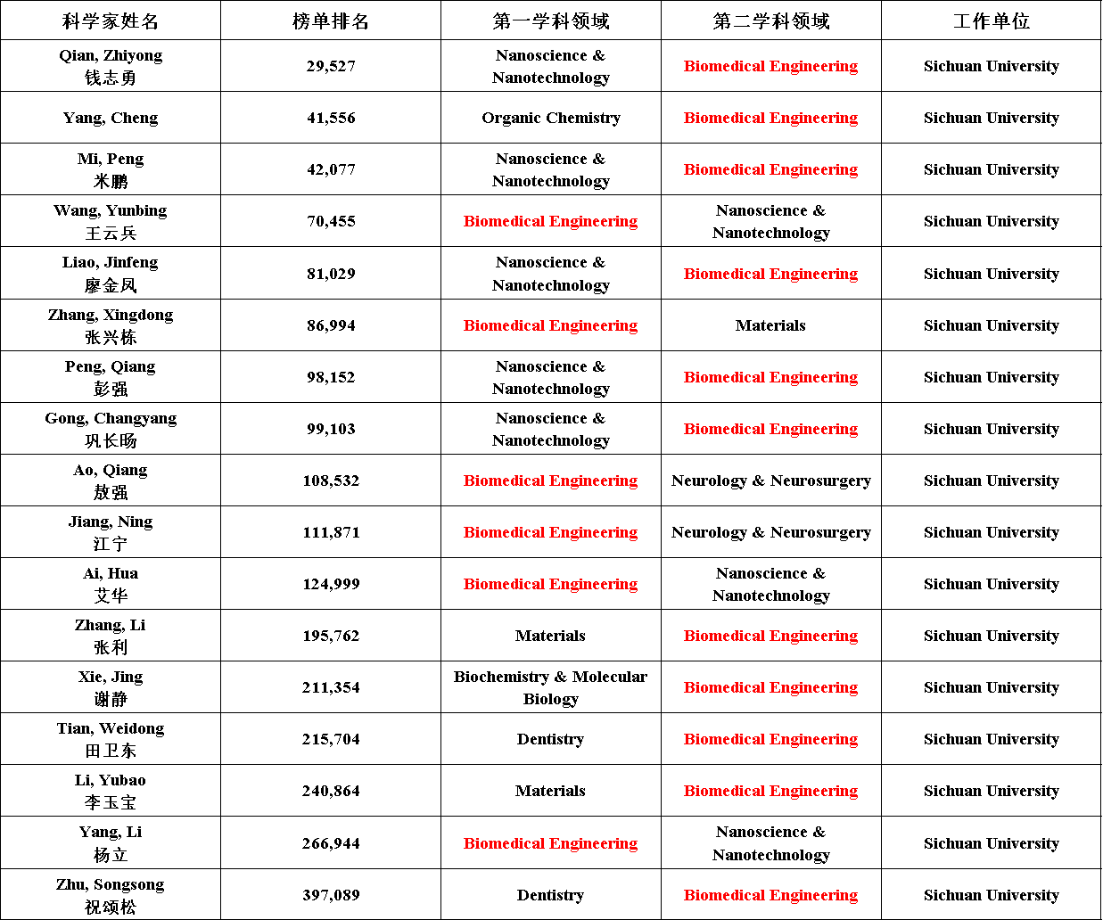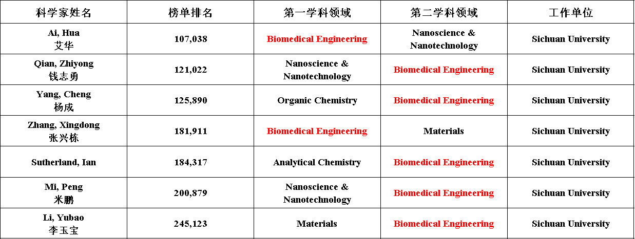 我校生物医学工程学科共有7人上榜终身科学影响力榜单。其中以生物医学工程作为第一学科的共有2人;以生物医学工程作为第二学科的共有5人。