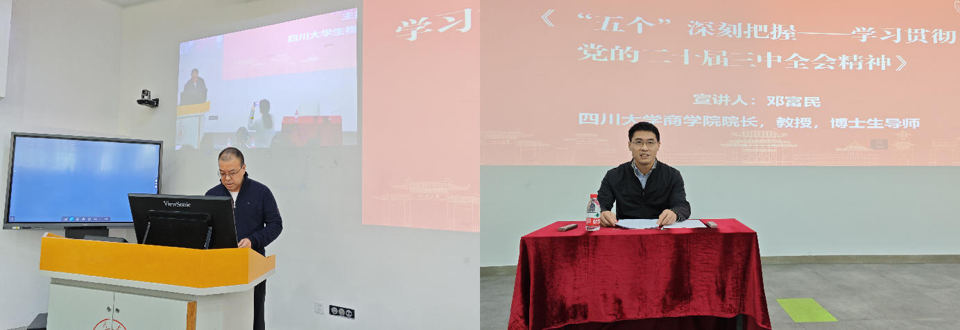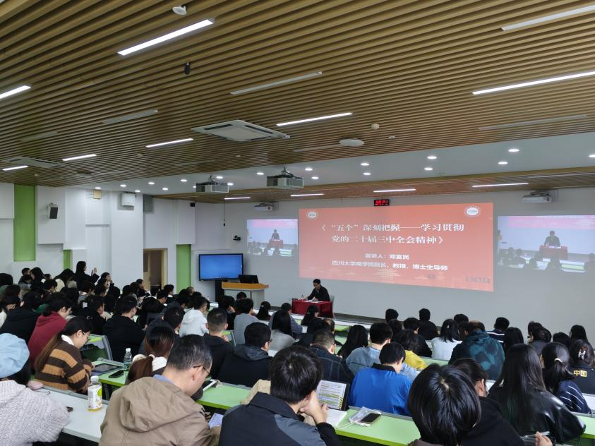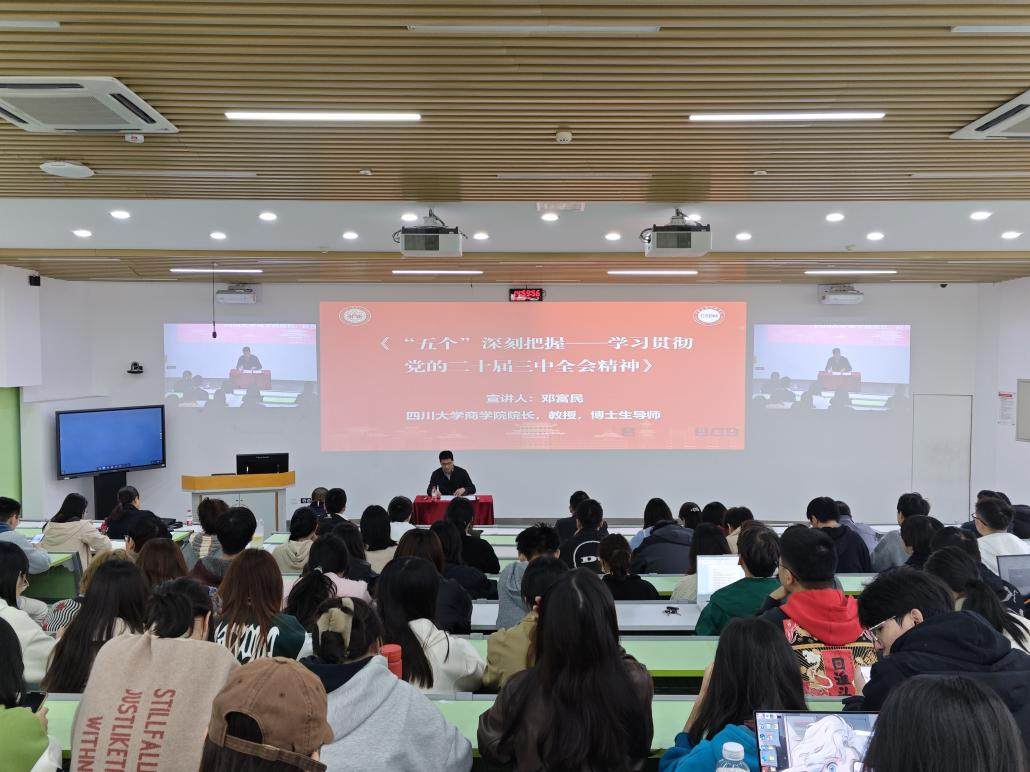 为深入贯彻落实党的二十届三中全会精神,全面促进学院党建与事业的深度融合发展,11月14日下午,我院专程邀请了商学院院长邓富民教授,在望江校区基础教学楼C-01为学院党员师生开展了题为“‘五个’深刻把握——学习贯彻党的二十届三中全会精神”的学习。学院党委书记韩宇主持了本次学习。