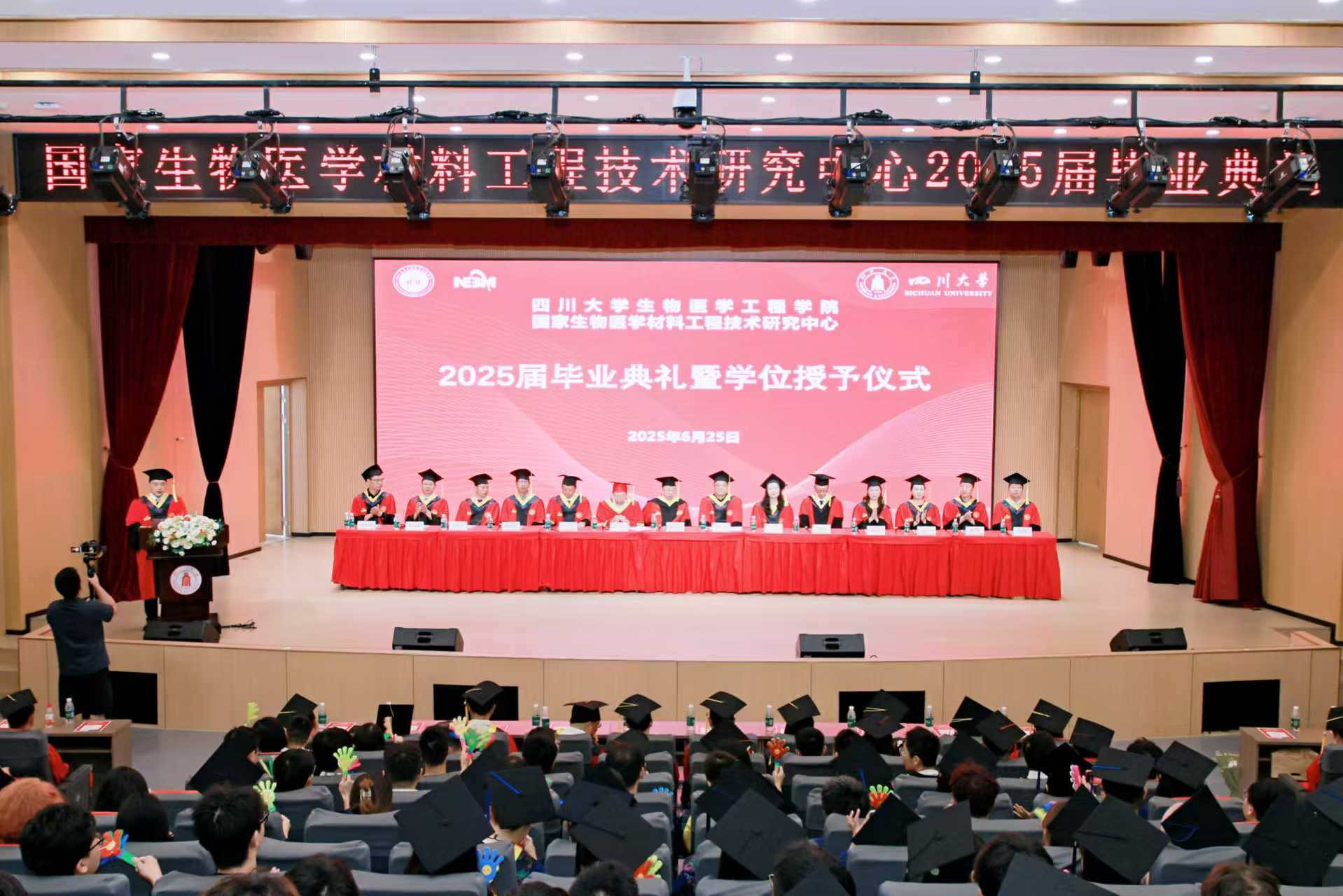 6月25日上午,william威廉中文官网,williamhill英国官网/国家生物医学材料工程技术研究中心2025届毕业典礼暨学位授予仪式在望江校区文华活动中心举行。2025届全体毕业生身着学位服齐聚一堂,共襄毕业典礼这一庄重盛典。中国工程院院士张兴栋、院党委书记韩宇、院长/国家生物材料中心主任王云兵、副院长林江莉,学院/中心研究生导师代表、辅导员老师和毕业生家长参加了典礼。典礼由院党委副书记田单主持。