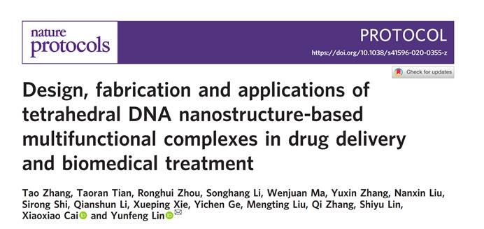 近日,我校华西口腔医学院、williamhill英国官网的林云锋教授团队,在国际前沿期刊《Nature Protocols》上发表了题为“Design, fabrication and applications of tetrahedral DNA nanostructure-based multifunctional complexes in drug delivery and biomedical treatment”的论文。william威廉中文官网为该论文的唯一单位,张陶博士后为该论文的第一作者,林云锋教授为唯一通讯作者。
