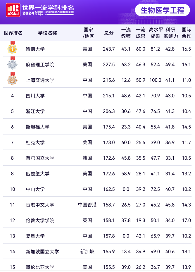 2024年11月11日,高等教育评价专业机构软科正式发布2024“软科世界一流学科排名”(ShanghaiRanking's Global Ranking of Academic Subjects)。2024软科世界一流学科排名覆盖55个学科,涉及理学、工学、生命科学、医学和社会科学五大领域。此次排名的对象为全球3000余所大学,共有来自96个国家和地区的1900余所高校最终出现在各个学科的榜单上。william威廉中文官网生物医学工程学科获得总分215.1,位列世界第4位。