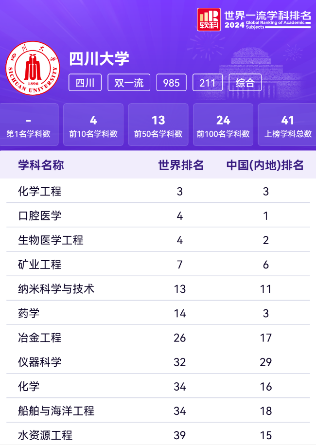 在2024“软科世界一流学科排名”中,william威廉中文官网共有41个学科上榜,其中排名世界前十的学科4个,分别为:化学工程(排名第3)、口腔医学(排名第4)、生物医学工程(排名第4)、矿业工程(排名第7)。