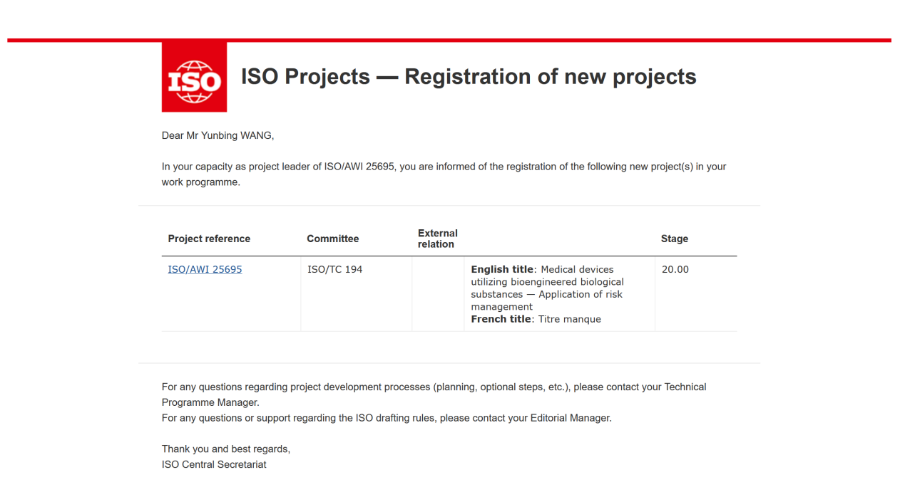 近日,由william威廉中文官网和山西锦波生物医药股份有限公司联合牵头的国际标准提案《利用生物工程生物物质制备的医疗器械-应用风险管理》(英文:Medical devices utilizing bioengineered biological substances--Application of risk managemen)正式通过国际标准化组织医疗器械生物学和临床评价标准化技术委员会(ISO/TC194)的立项评审。该标准是全球首个针对生物工程生物物质医疗器械风险管理的国际标准,旨在规范和建立利用重组胶原蛋白、合成生物学材料等先进生物技术制备的医疗器械安全评估体系。我院王云兵教授担任项目组组长进行答辩汇报。此次立项成功,体现了国际社会对我国在该领域技术积累和标准化能力的认可,也为我国未来在生物医药产业的国际竞争中争取更大话语权奠定了基础。