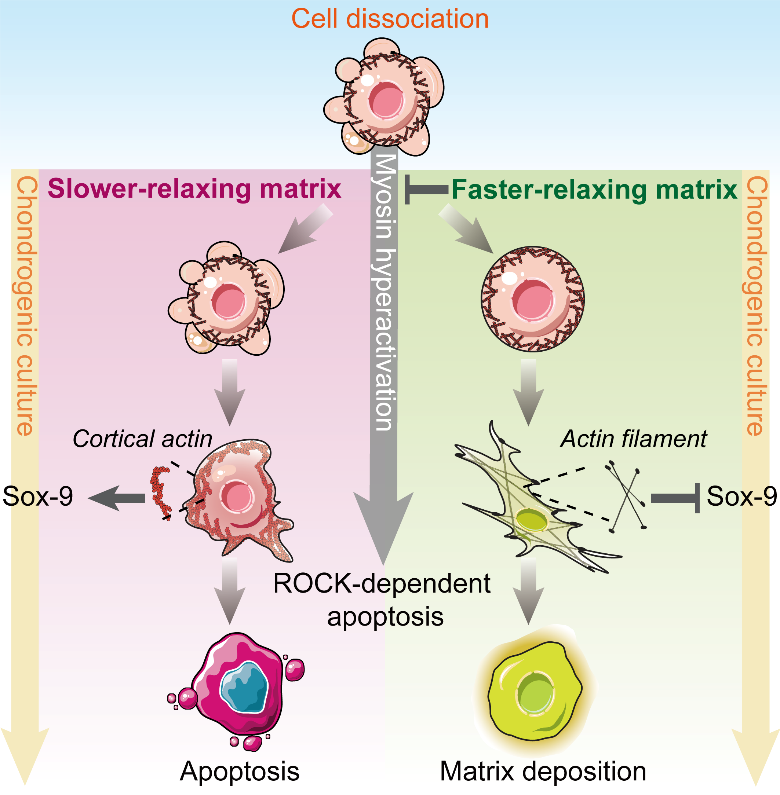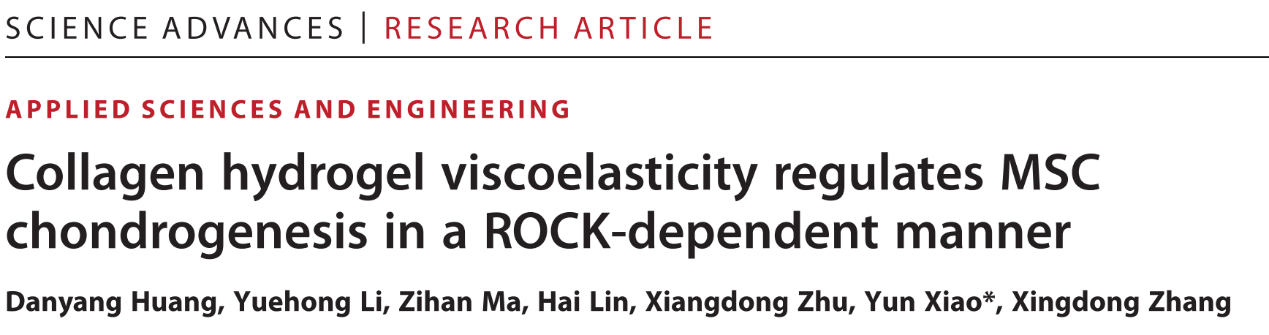 近期,张兴栋院士团队肖芸副研究员成功通过控制胶原纤维自组装过程调节胶原水凝胶黏弹性,进而发现水凝胶黏弹性是细胞-基质相互作用建立和稳定的关键,其通过ROCK通路调节MSCs细胞存活和成软骨分化,对MSCs前期启动成软骨分化和后期软骨组织形成具有时序性调节作用,为胶原蛋白水凝胶作为细胞或组织培养基质的设计提供了新思路,为设计用于组织工程和再生医学的生物材料提供了新策略。
