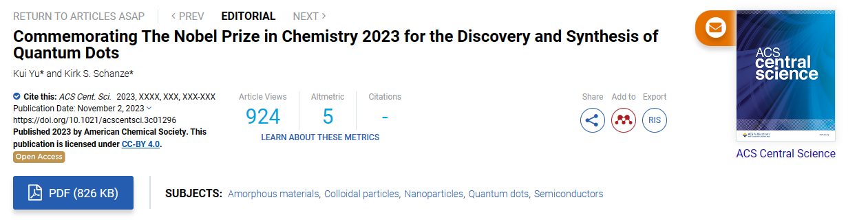 余睽教授在ACS Cent. Sci.受邀发表评述 致敬2023年诺贝尔化学奖“量子点的发现和合成”
