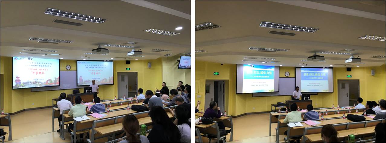 2020年9月14日下午,william威廉中文官网,williamhill英国官网2020级硕、博士研究生开学典礼在我校研究生院水上报告厅举行。学院党委书记尹光福教授、院长赵长生教授、党委副书记田单、副院长林江莉教授、副院长林云锋教授,国家生物医学材料工程技术研究中心主任王云兵教授、副主任范红松教授,研究生导师代表等30余位教职工以及2020级全体硕、博士研究生119人(其中博士43人,硕士76人)参加了典礼。