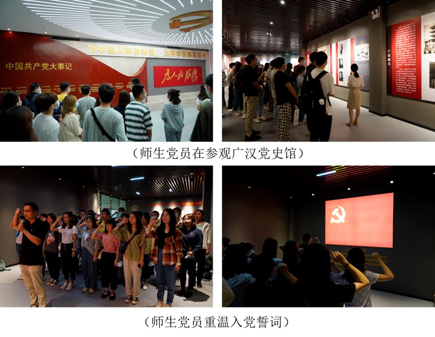 广汉历史悠久,文化灿烂,是长江文明之源、改革之乡、航空之城。广汉党史馆是广大党员同志党史学习教育的重要阵地。上午9:30,支部一行人抵达后,在党史馆刘豫老师的讲解下,师生党员分别从名城春秋、新民主主义革命时期、社会主义革命和建设时期、中国特色社会主义新时代逐步领略了广汉市悠久的历史文化、中国共产党在广汉建立和发展的历程、广汉起义以及改革开放以来在党的带领下广汉发生的翻天覆地的变化。从这座“地上三星堆,天上飞机飞”的城市的发展进程中,大家对党的伟大成就有了更为具体的认识。参观结束后,全体党员同志在鲜艳夺目的党旗下重温入党誓词,再次将共产党人“对党忠诚、信念坚定、艰苦奋斗、甘于奉献”的精神牢记于心。