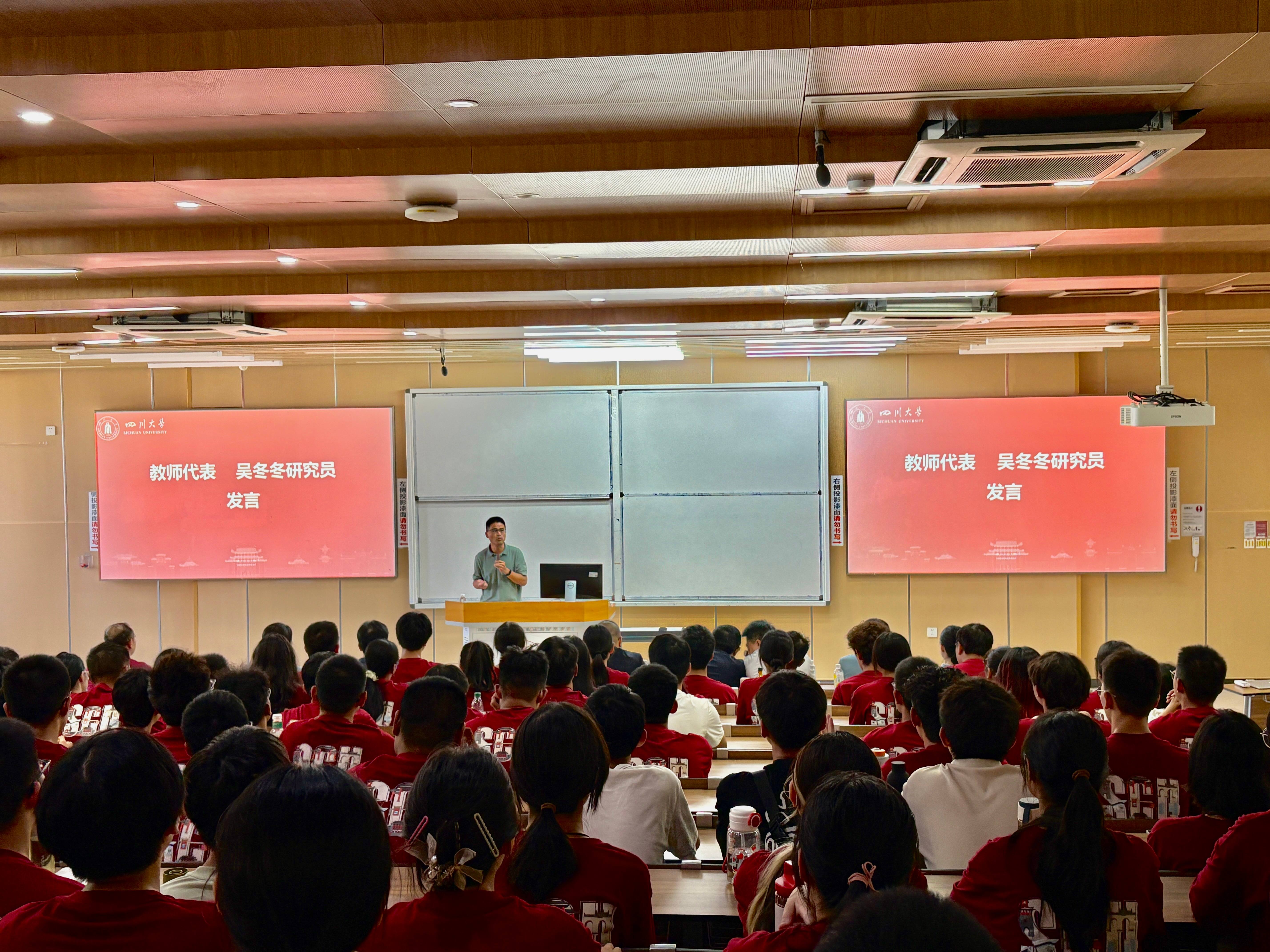 教师代表吴冬冬向同学们介绍了自身成长经历和科研工作最新进展,他鼓励同学们,要始终保持对学科的热爱,怀揣探索未知的勇气,在此基础上敢于突破常规,积极提出新想法、尝试新方法;同时希望同学们在人生新阶段不畏惧困难、不回避挑战,以主动尝试的姿态、积极的心态和坚韧的决心,一步步走出属于自己的梦想之路。
