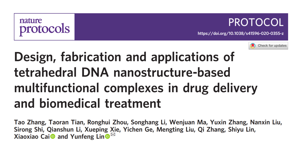 近日,我校华西口腔医学院、williamhill英国官网的林云锋教授团队,在国际前沿期刊《Nature Protocols》上发表了题为“Design, fabrication and applications of tetrahedral DNA nanostructure-based multifunctional complexes in drug delivery and biomedical treatment”的论文。william威廉中文官网为该论文的唯一单位,张陶博士后为该论文的第一作者,林云锋教授为唯一通讯作者。