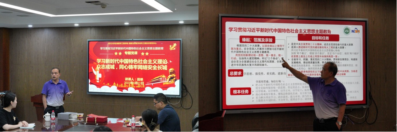 在会议第一篇章,田单书记介绍了习近平新时代中国特色社会主义思想主题教育情况并提出总体要求。他强调,身为共产党员应当严格按照党中央提出的“学思想,强党性,重实践,建新功”总要求,学习贯彻习近平新时代中国特色社会主义思想,努力做到“学思用贯通、知信行统一”。习近平新时代中国特色社会主义思想的主题学习教育使全党更加紧密地团结在以习近平同志为核心的党中央周围,为奋进新征程建功新时代提供坚强有力的政治引领和政治保障。随后,田单书记深入分析了新时代对网络工作的若干要求,结合近期的一些网络舆情实例,教育党员要深刻认识到网络安全是国家安全重要的组成部分之一,身为一名共产党员更要注重自身的网络素养,不发布、不传播不实信息,众志成城,同心筑牢网络安全长城。